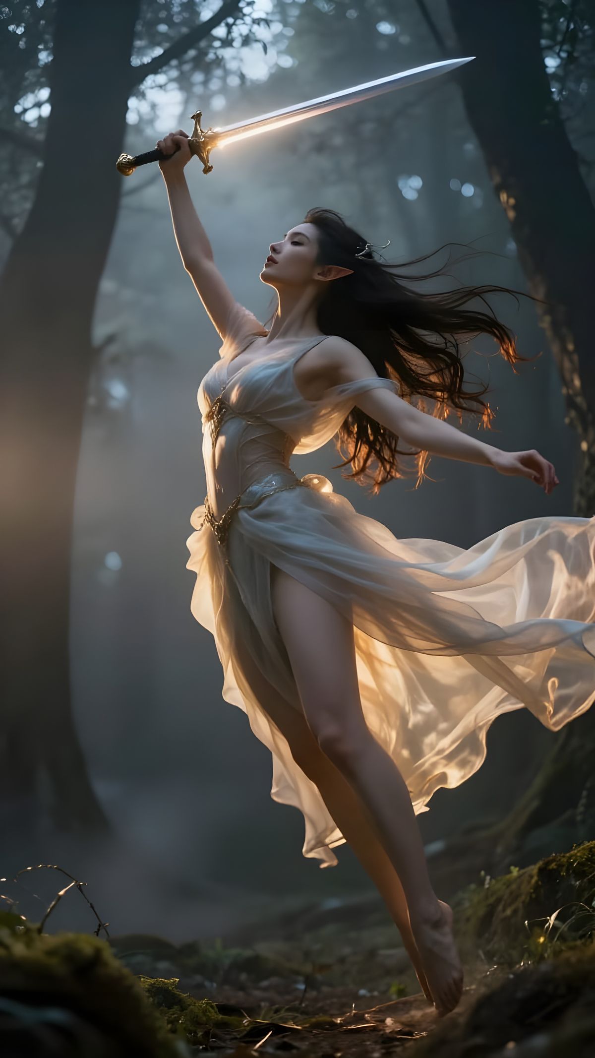 This image shows a powerful elven warrior mid-leap in an enchanted forest. Cinematic lighting highlights her dynamic pose and glowing sword, creating a moody, atmospheric scene.