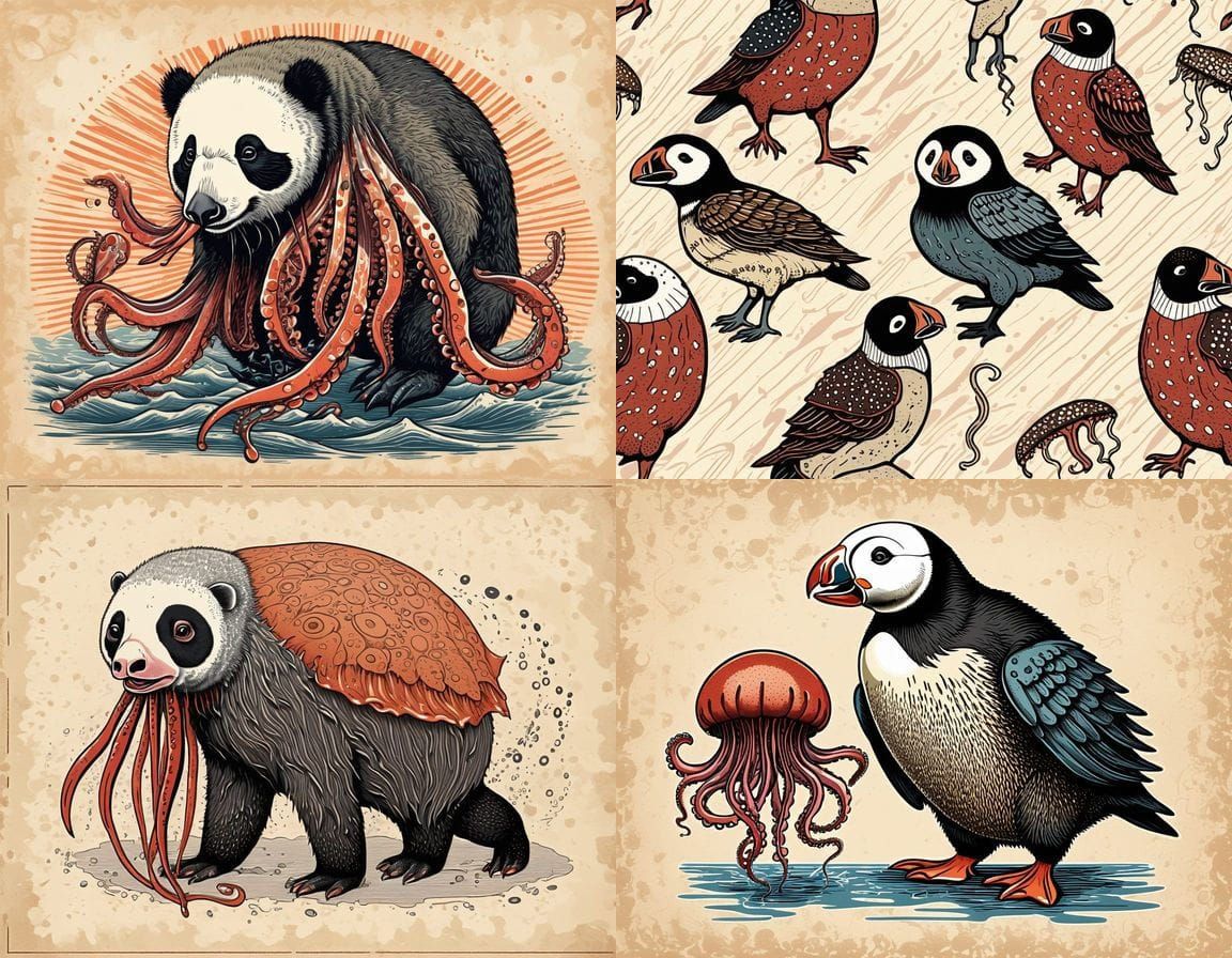 A bizarre, mutated creature resembling a hybrid of various animals, rendered with clear edges and striped and dotted textures. The artwork features faded, uniform colors and a natural background.