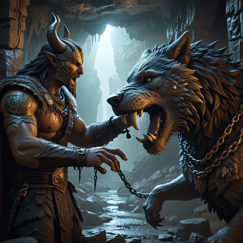 This image shows a dramatic close-up of Tyr, a Norse god, with his hand inside the mouth of the bound wolf Fenrir, set in a mystical cave with earthy tones and mystical runes.