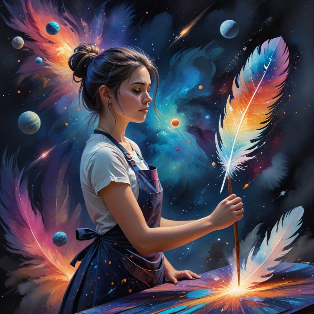 This vibrant painting depicts a young girl at work, surrounded by whispering comets and a kaleidoscope of nebula hues, as she brings the cosmos to life with bold brushstrokes and textured gouache colors