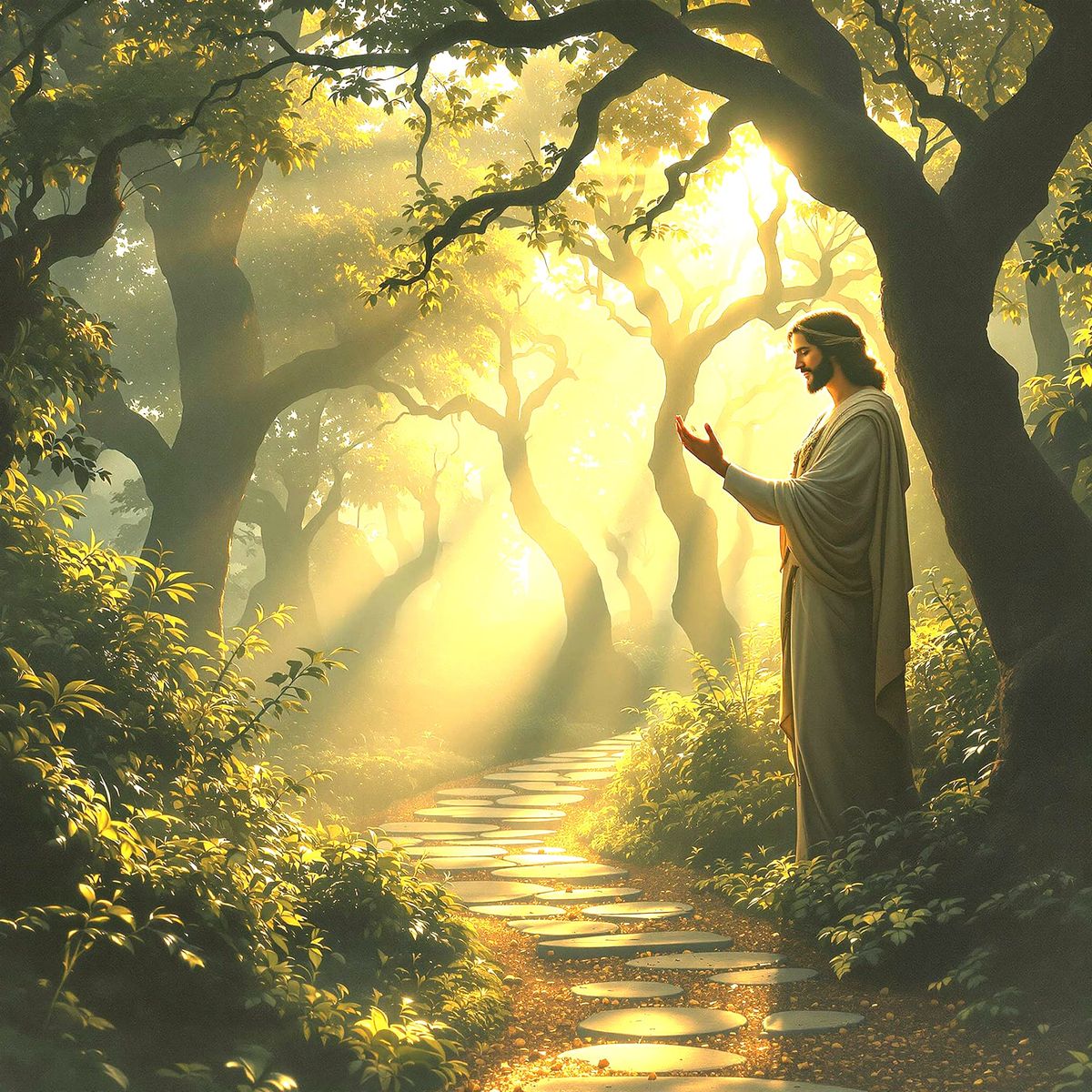 This image captures a serene Jesus figure with a gentle smile in an enchanted forest, bathed in soft, ethereal light. Rendered with a painterly, dreamlike quality reminiscent of 1920s glamour photography.