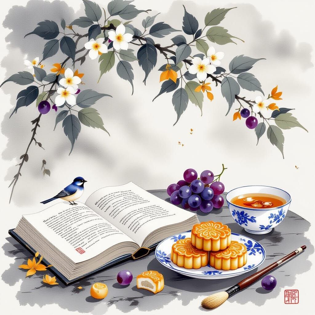 This elegant painting captures a poetic Chinese still life. Features an open calligraphy book, mooncakes, grapes, tea, and osmanthus flowers, with a blue bird. Rendered in an ink wash style with painterly textures.