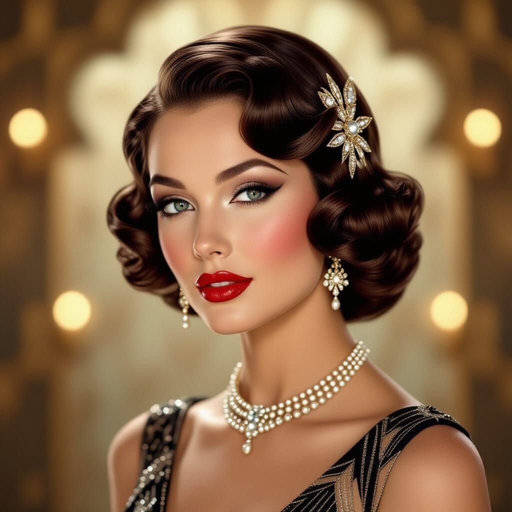 A stylized Art Deco portrait of a glamorous Hollywood starlet, with dramatic makeup, finger waves hairstyle, and intricate, geometric accessories, set against a backdrop of a luxurious, vintage movie set.