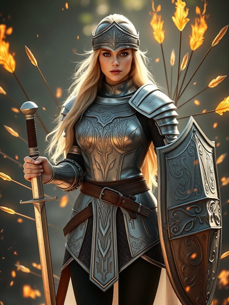 This image shows a full-bodied, beautiful, blonde, ethereal woman warrior in fantasy silver armor. The 3D rendered digital art depicts her holding a sword and shield amidst flaming arrows, with a cinematic, photorealistic style.