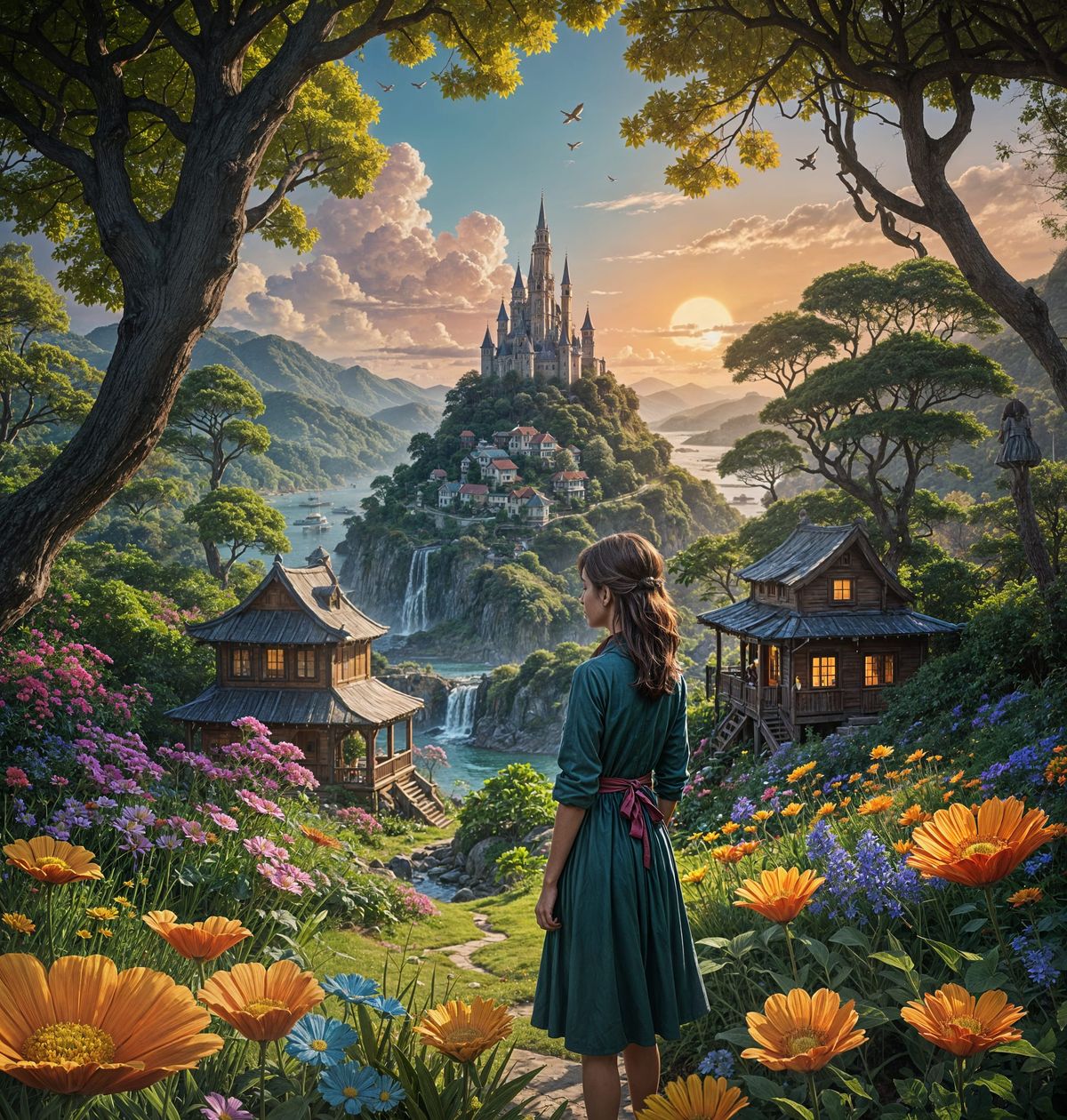 This image depicts a vibrant weekly calendar, with each day illustrated as a unique scene. It transitions from serene mornings to active workdays and romantic sunsets, blending activity and calm.