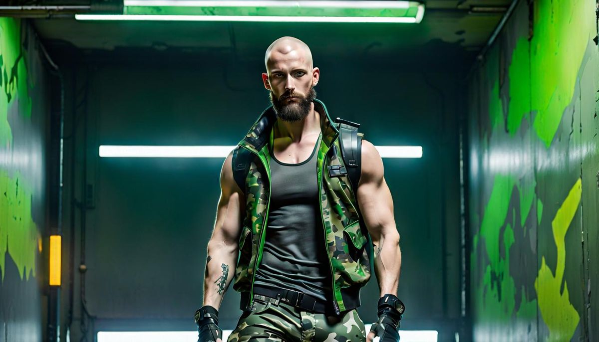 This image shows a muscular man in futuristic military-style clothing. He has a shaved head and green eyes, and the image has a cyberpunk aesthetic with neon accents.