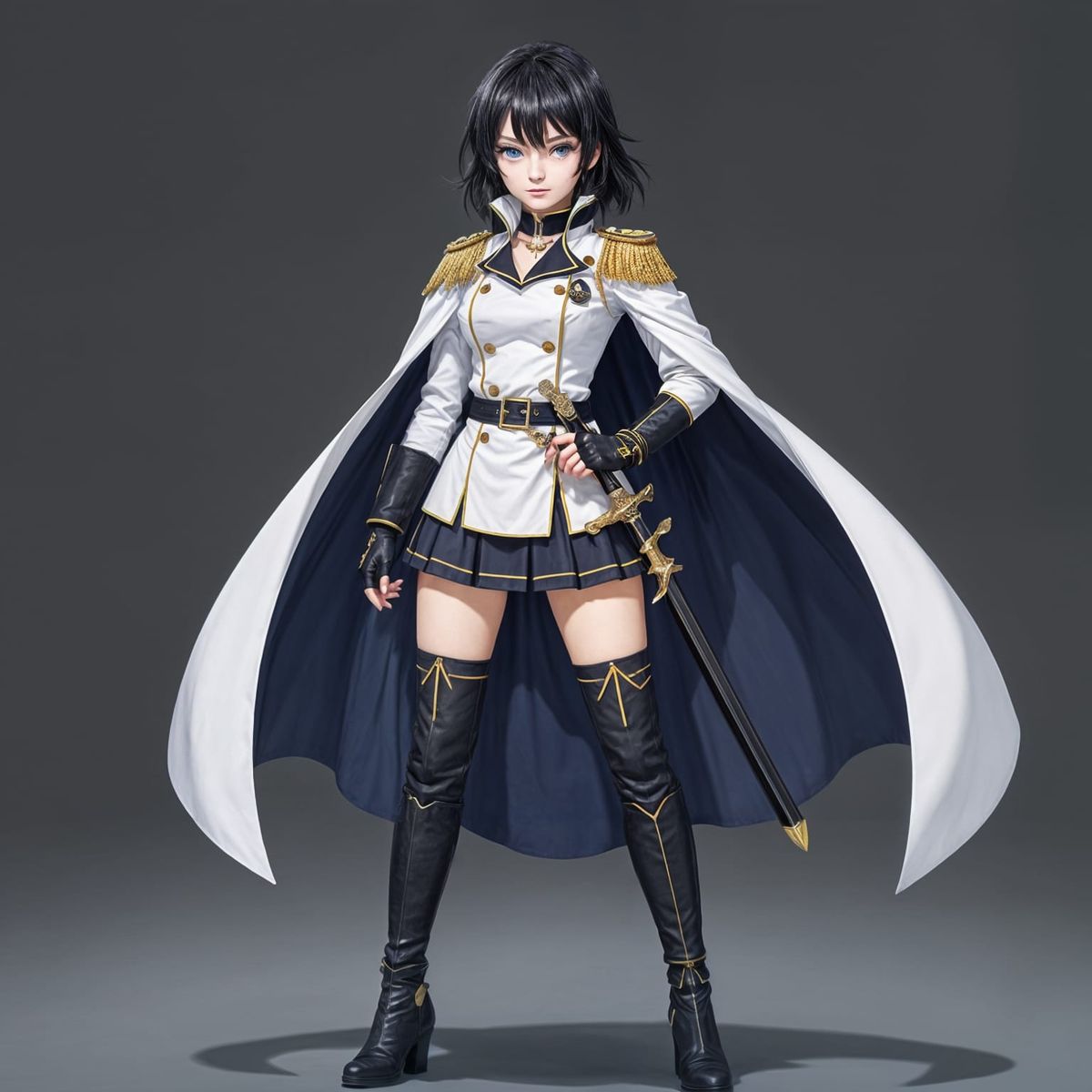 This image depicts a striking anime-style female admiral in a white navy uniform, complete with a sword, cape, and elegant accessories. She has black hair and blue eyes.