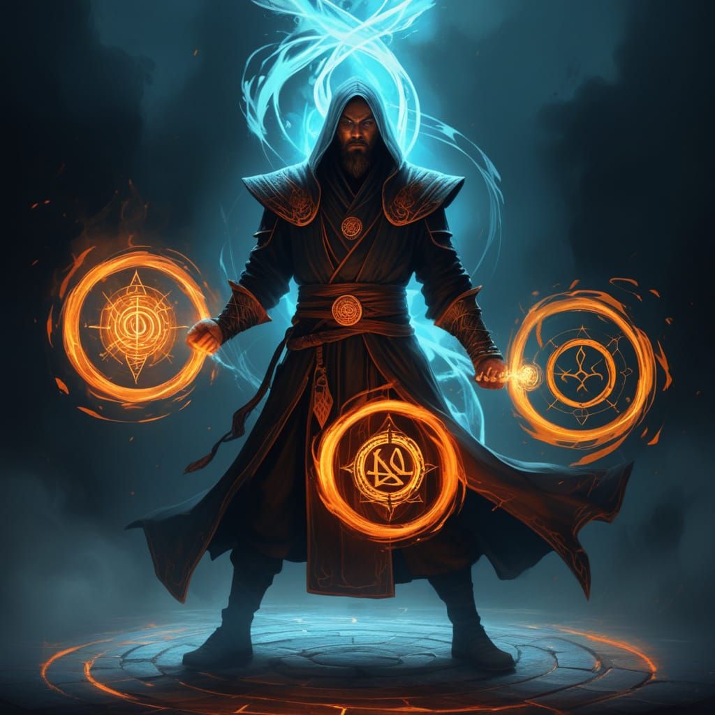 Concept art of a human sorcerer in a duel stance, with an ethereal glow and fiery runes. Digital painting with dramatic lighting and contrasting colors.