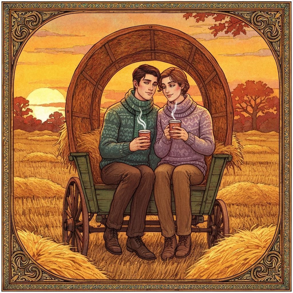 This image shows a young couple in a hay wagon enjoying hot cocoa as the sun sets over golden fields. The artwork evokes art nouveau and impressionist styles with vibrant autumnal colors.