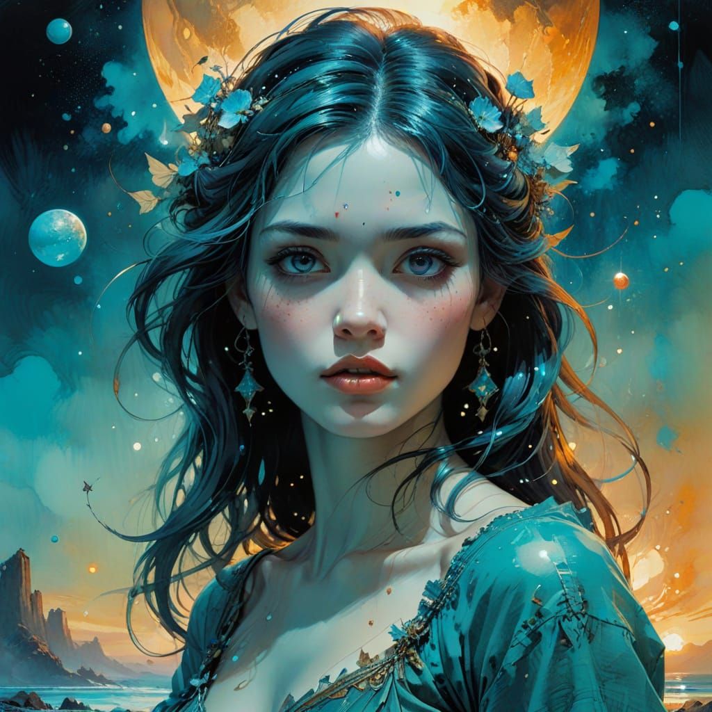 This image shows a surreal turquoise landscape where seasons blend under a twilight sky. The artwork features delicate brushstrokes, twinkling stars, and astral planets in a dreamy, ethereal style.