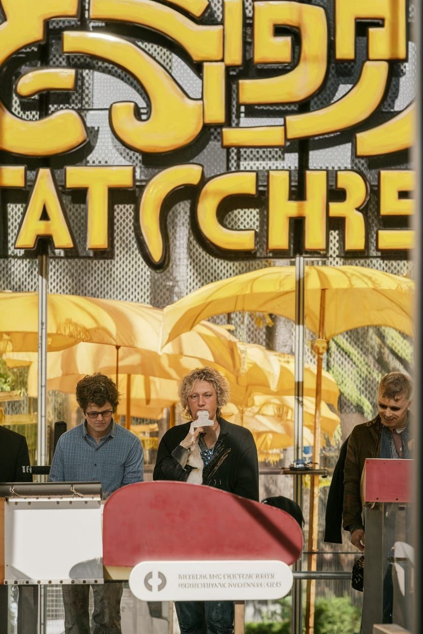 This image depicts a futuristic robot, Mecha Norma, standing on Sunset Boulevard in a vibrant, dystopian setting. The artwork blends elements of science fiction and surrealism, with a focus on the intersection of technology and human experience.