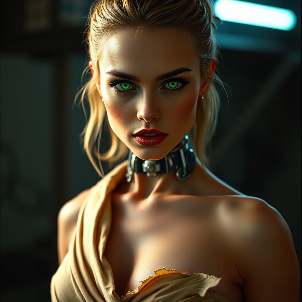A striking picture of a beautiful cyborg woman. The torn skin suit reveals metallic ribs and spine, with bright green eyes and parted lips. The image is rendered with cinematic lighting and rich atmospheric tones.