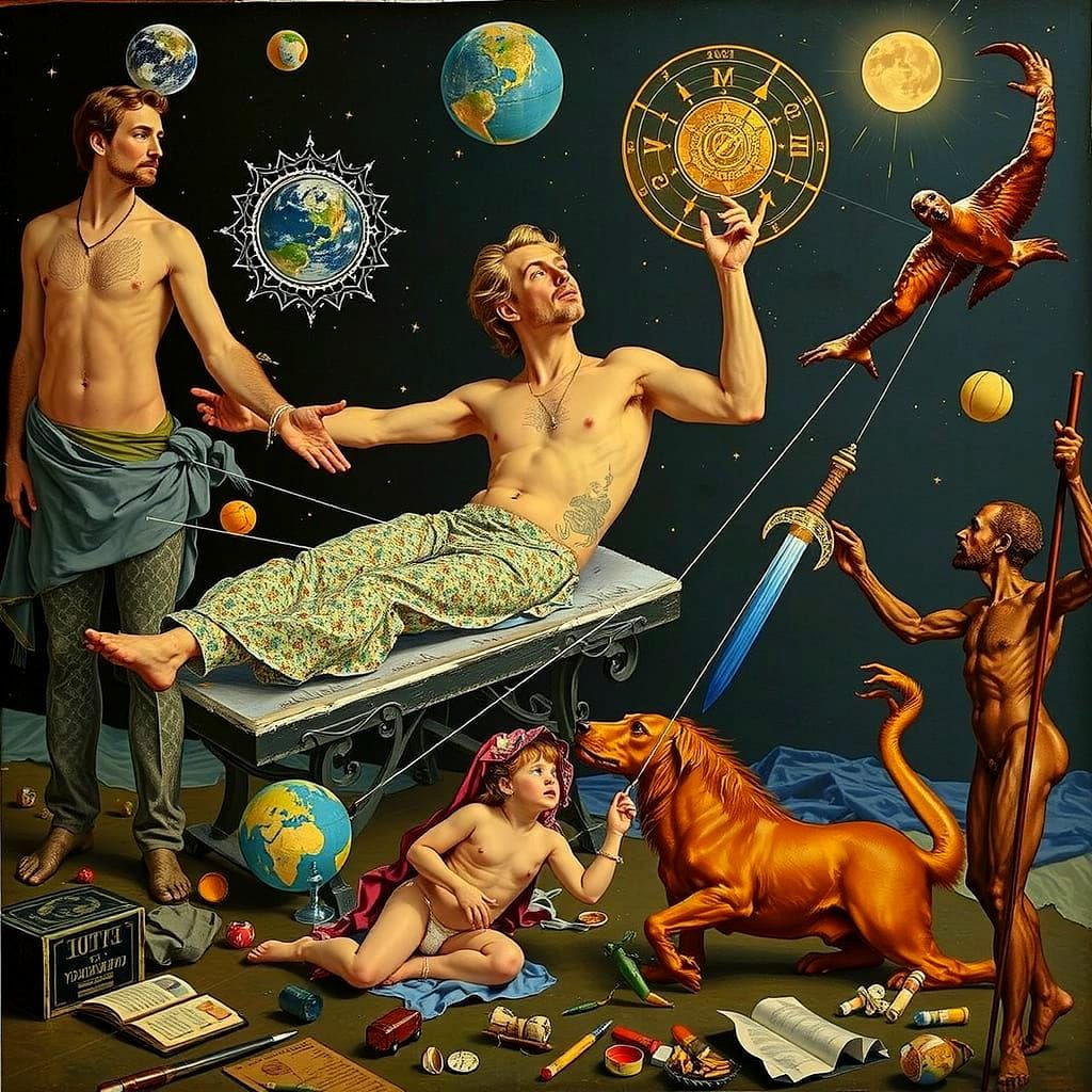 This image is what an AI image generator created when given a very simple prompt about various fields of study. The fields include phenomenology, cosmology, anthropology, pharmacology, geology, and ontology.