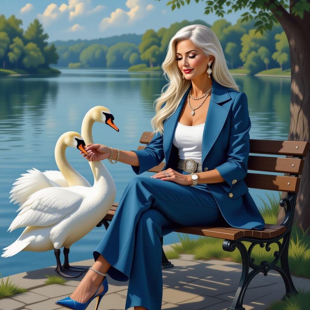 A photorealistic image of a middle-aged blonde woman sitting by a serene lake feeding swans. She is wearing a strapless tank top, wide pants, and a blue jacket, rendered with precise details.