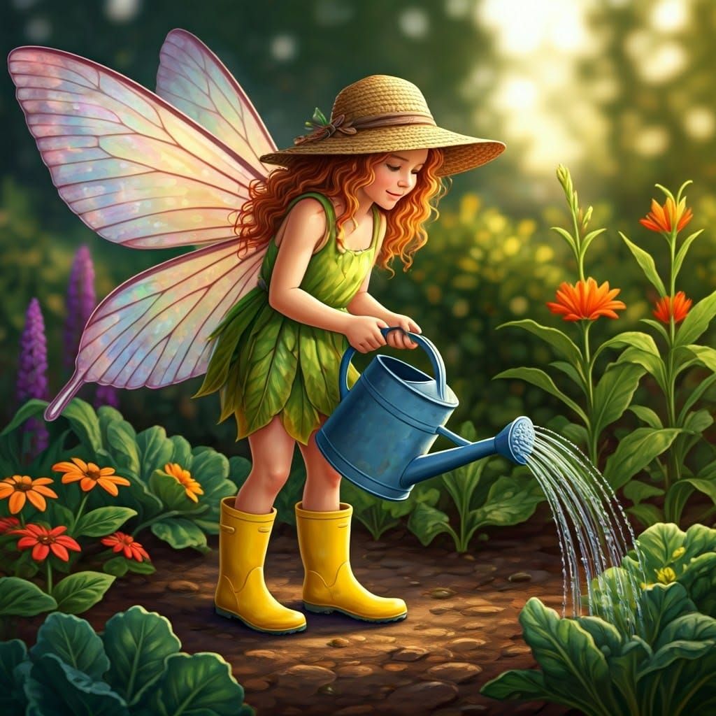 This enchanting digital painting depicts a delicate fairy nurturing her lush garden with an antique blue watering can and vibrant flowers, amidst soft foliage and twinkling dew droplets, in a captivating, dreamy style with intricate textures and delicate brushstrokes.