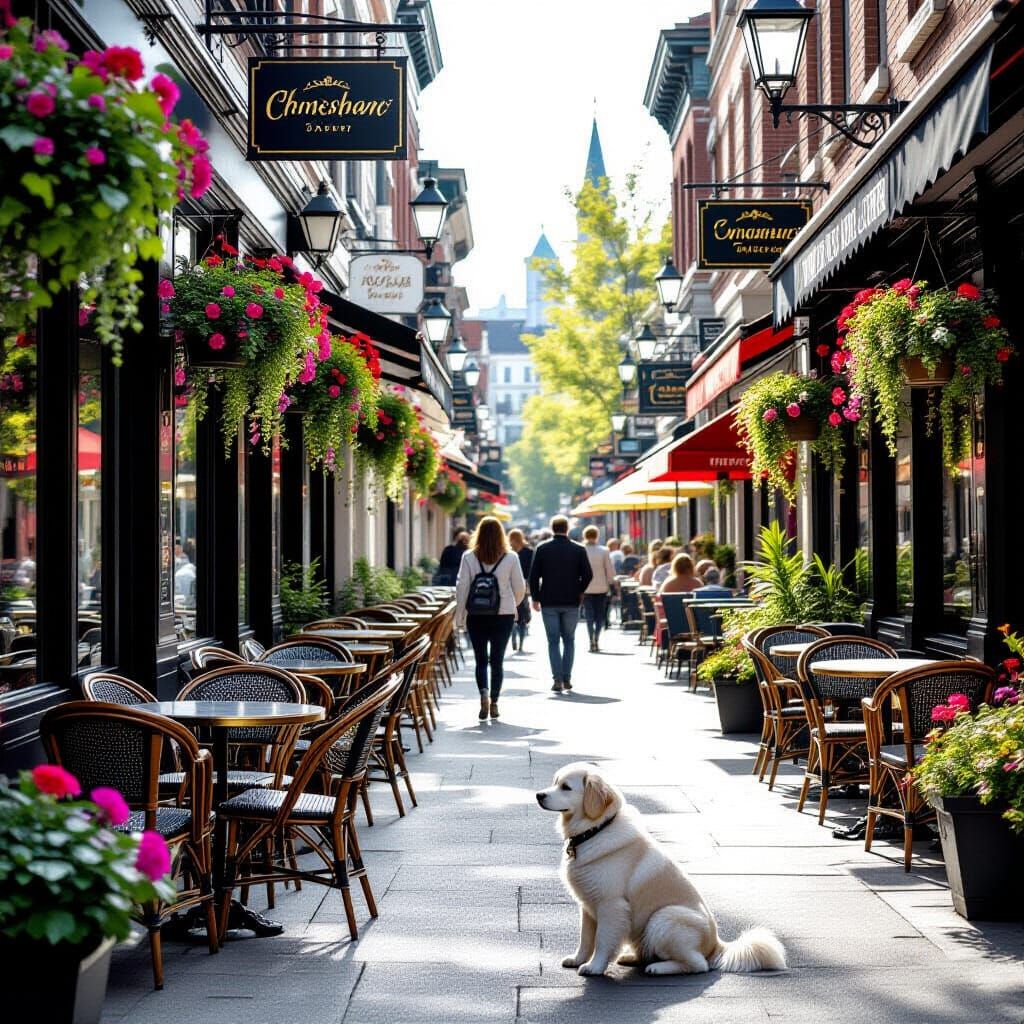 A vibrant, photorealistic image captures a bustling downtown street with outdoor dining. Shops and restaurants feature black and white tables and chairs, with people and a dog enjoying the day.