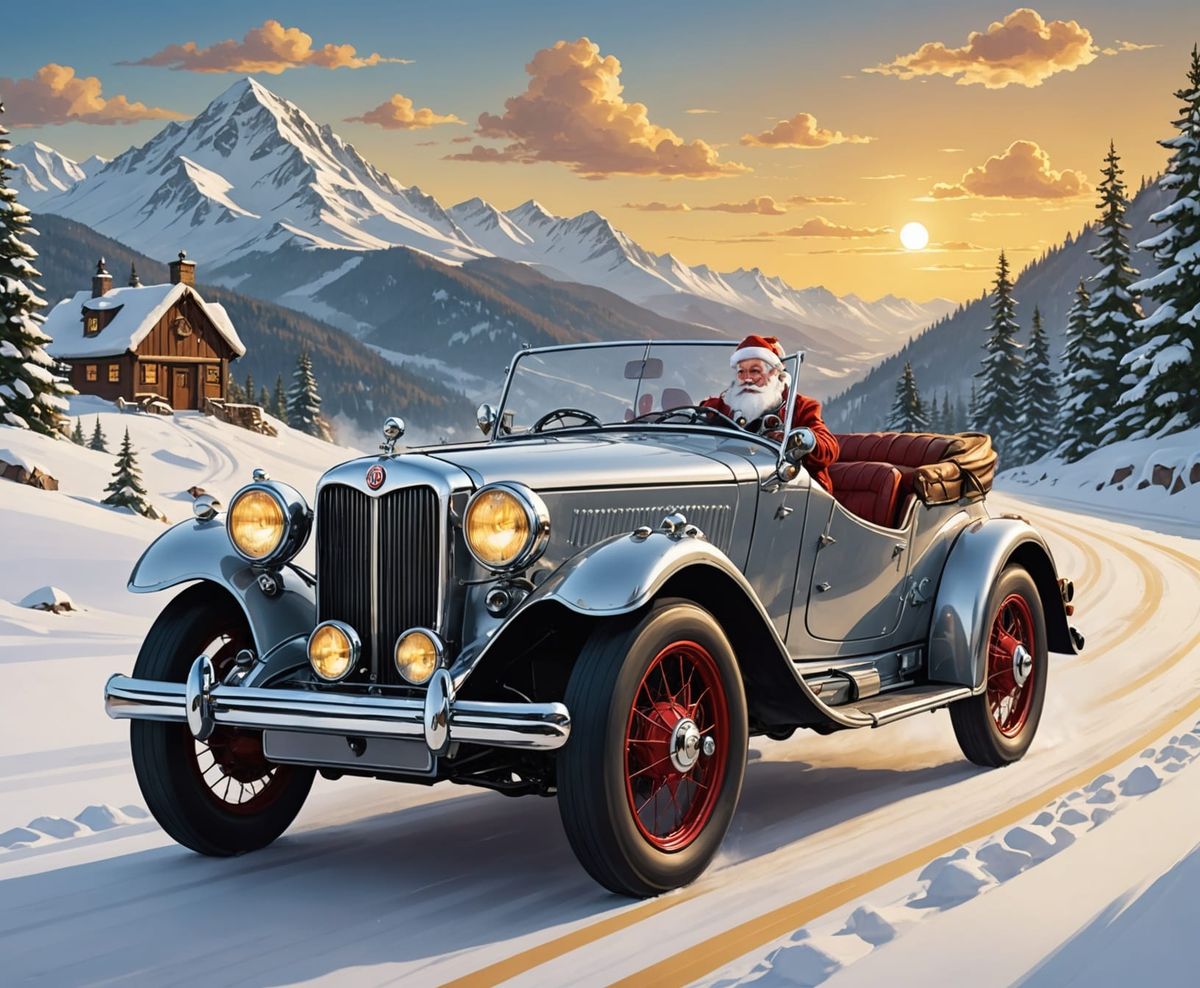 This image shows Santa Claus driving a vintage roadster through a snowy mountain landscape at sunset. A reindeer accompanies him amidst gifts, with stardust trailing behind in a whimsical, cinematic style.