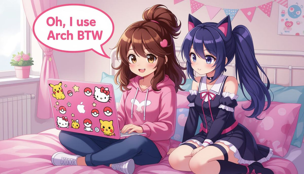 This image shows two friends, one bubbly and one sporty/goth, sitting on a pastel-colored bed. The bubbly girl's pink laptop has Pokemon and Hello Kitty decals and runs Arch Linux.
