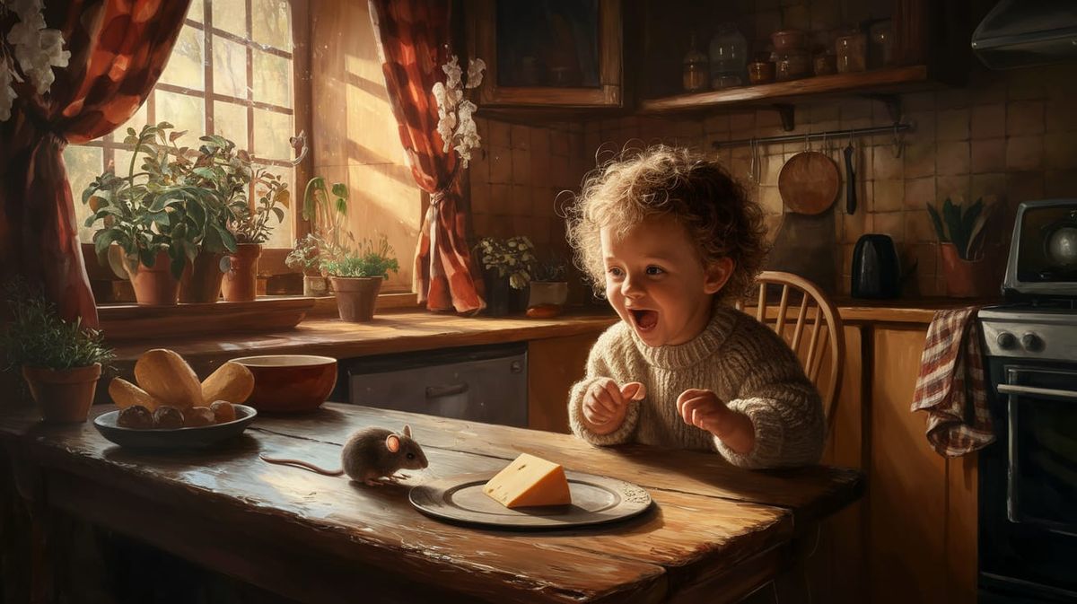 This image shows a young child with curly hair, fascinated by a mouse near some cheese on a rustic table. Warm sunlight fills the homey kitchen in this impressionist-style oil painting.