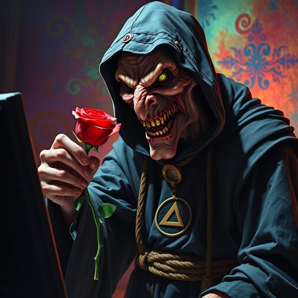 A horrifying image of a twisted sorcerer in a dark cloak offering a rose to a screen. The character's menacing grin and sharp features are rendered in a dark, hyperrealistic style.