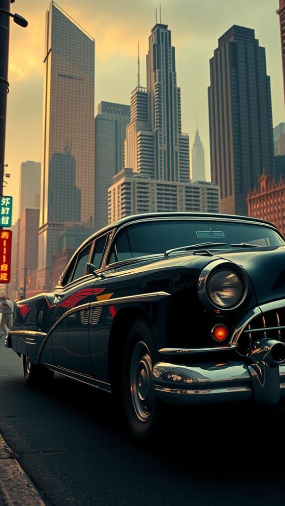 This captivating double exposure artwork blends a vintage car with a modern cityscape, featuring towering skyscrapers, neon lights, and muted tones with vibrant highlights, evoking a sense of film noir mystery and surrealism.