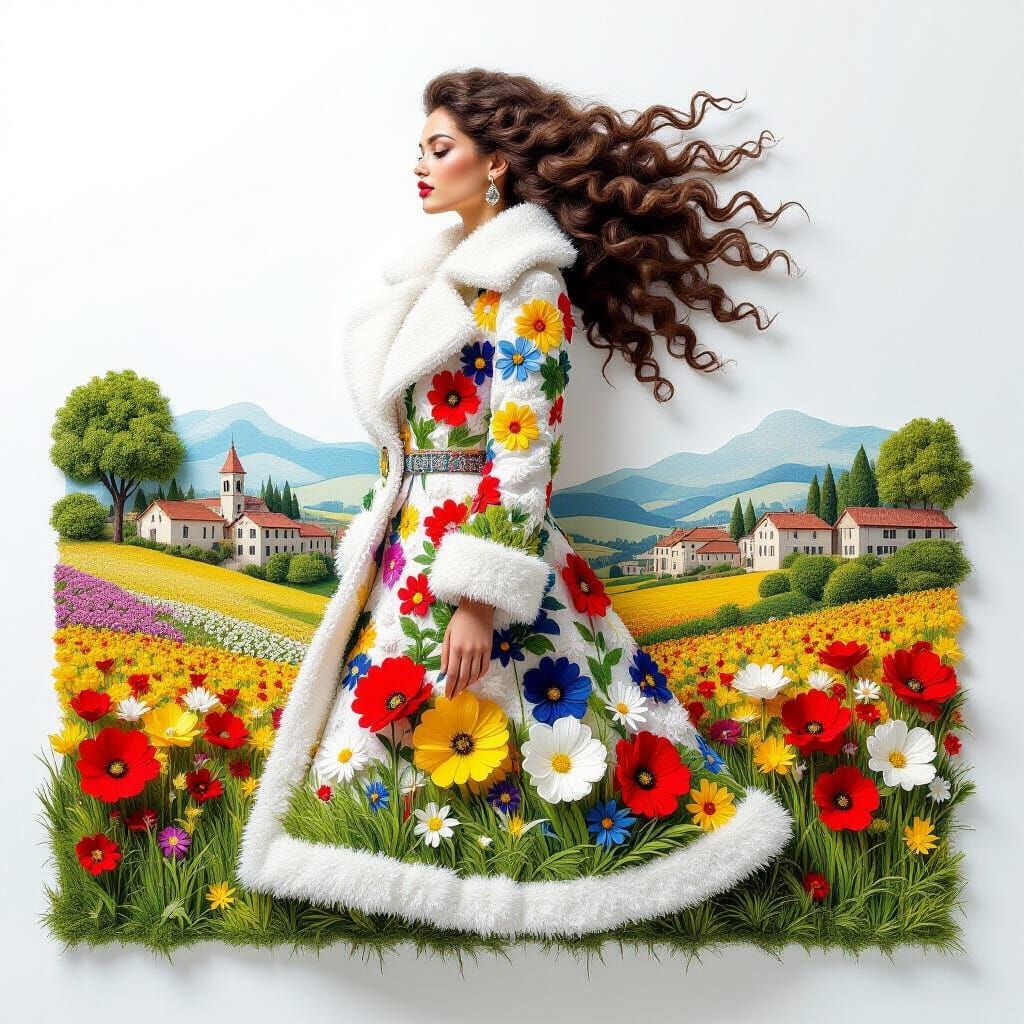 A striking image of a fashion model in a unique coat featuring a village and floral print. The artwork blends sketch and 3D bas-relief styles with delicate textures.