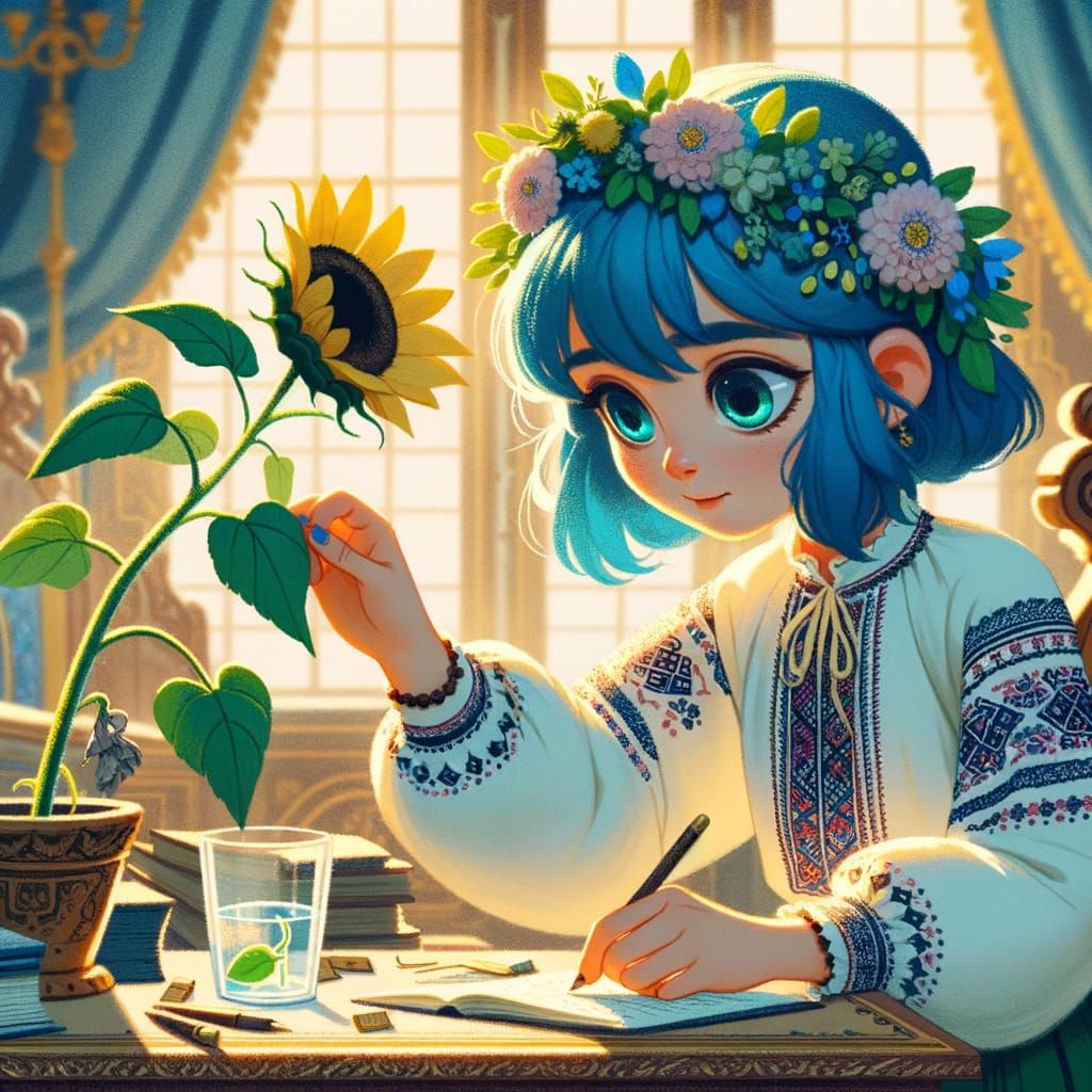 This image shows a blue-haired girl in a Ukrainian shirt and flower crown, carefully tending to a sunflower in a classic animation style. The scene evokes fragile optimism in a warm, light-filled sovereign's bedroom.