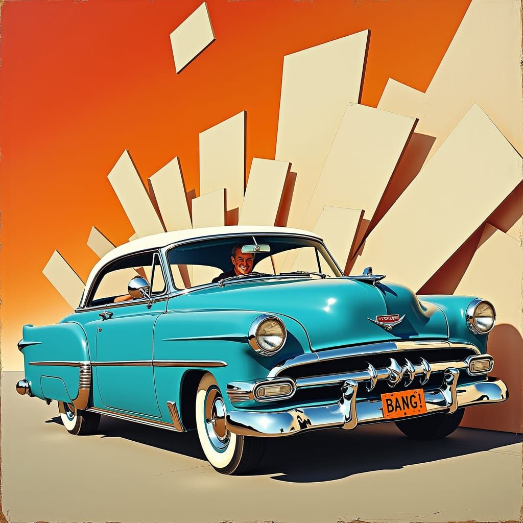 A vibrant pop art image depicting a bright blue 1950s American car crashing into a white brick wall. The driver grins, while the passenger looks fearful amidst the chaos. The scene has a humorous, ironic tone.
