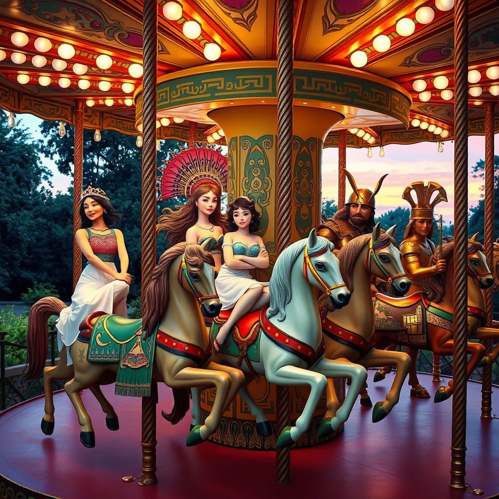 This image shows a vibrant, dreamlike carousel scene at dusk, surrounded by lush greenery and soft lighting. The carousel features ornate, hand-carved wooden horses with riders from various mythologies, including Japanese, Persian, Phoenician, Greek, and Roman, evoking the styles of Marc Chagall, Rene Ma...