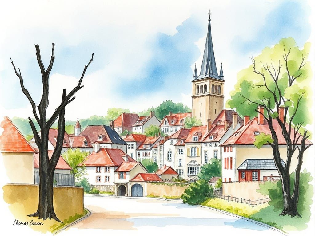 This image is a serene watercolor depiction of a charming French village, reminiscent of the Impressionist style, with delicate brushstrokes and soft colors