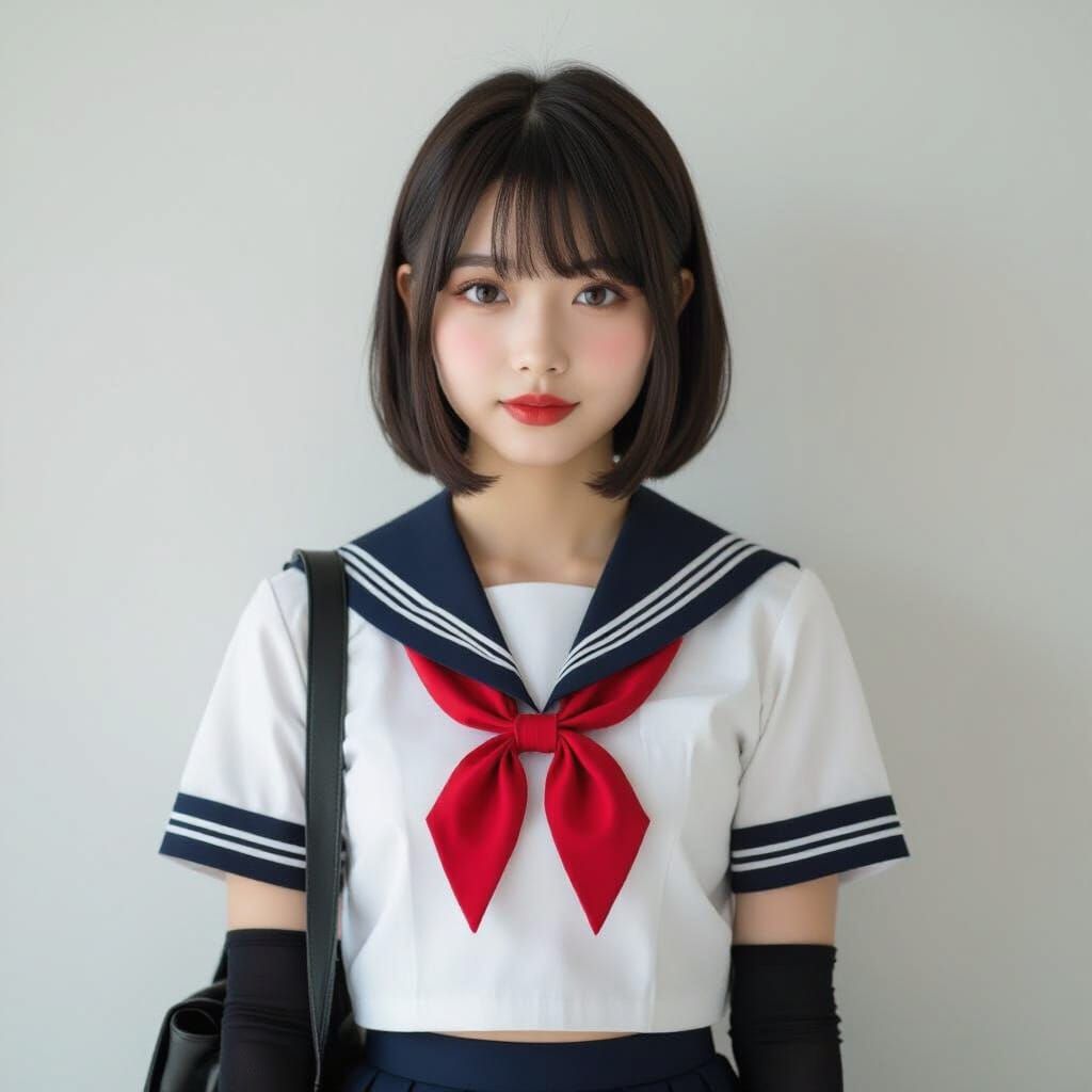 This image shows a Japanese teenage girl in a sailor fuku school uniform. The girl has a bob haircut and is standing against a white background. The image has a clean, anime-inspired aesthetic.