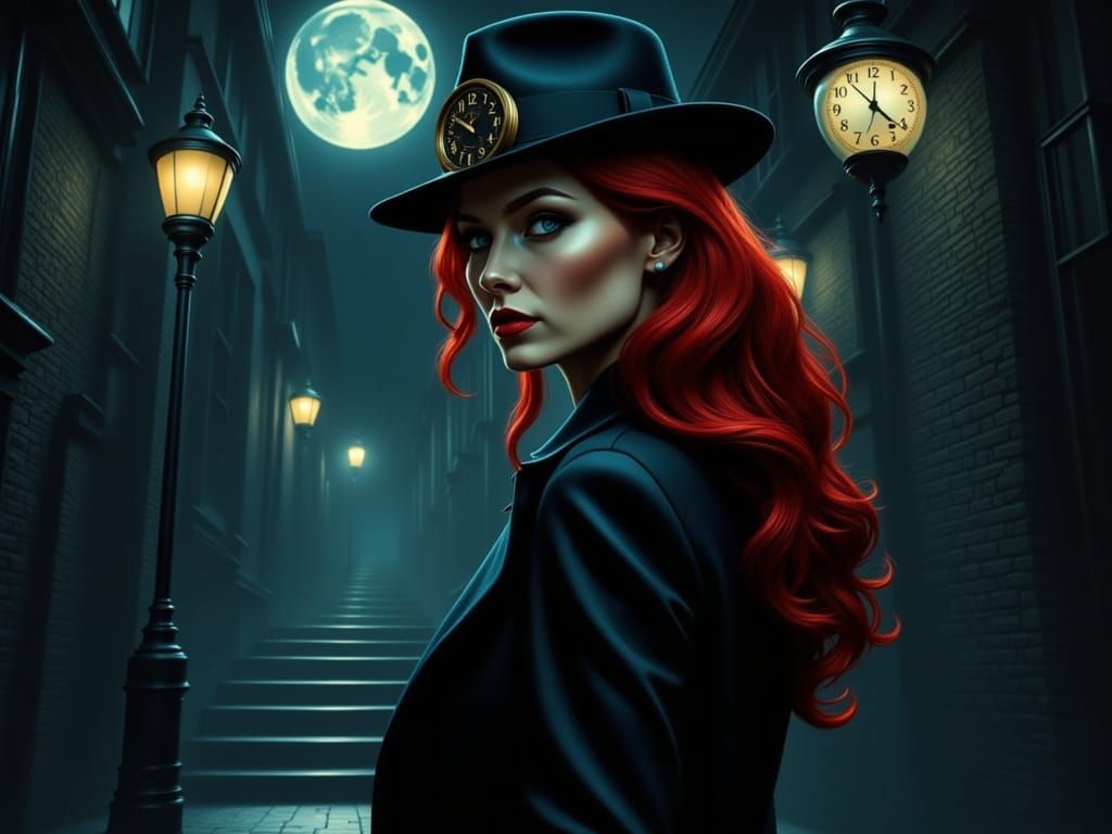 A striking picture of a red-haired woman walking at night. She wears a black trench coat and fedora with clockwork elements, rendered in a film noir style with high contrast.