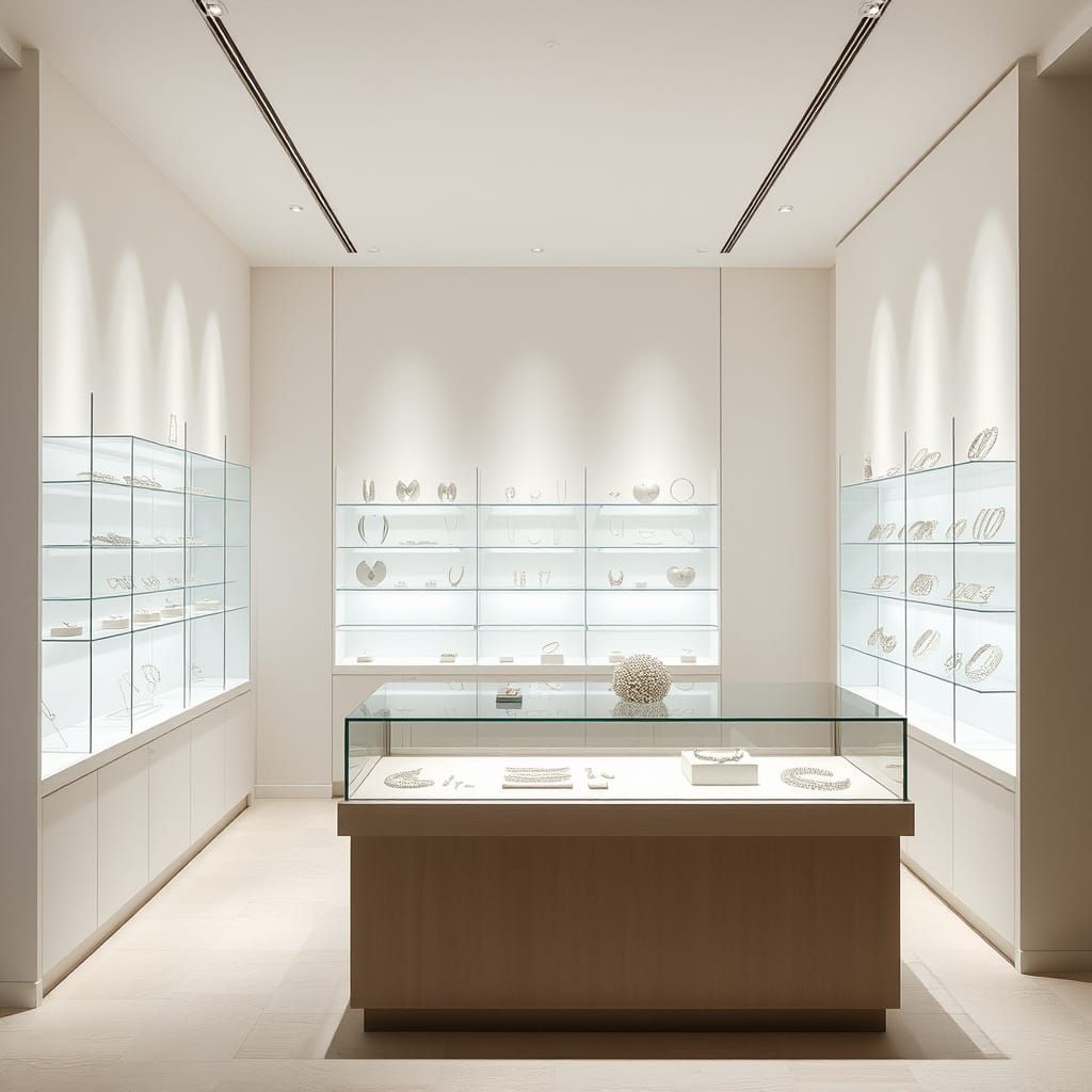 A sophisticated boutique featuring handcrafted silver jewelry. The store has a minimalist design with soft lighting that highlights each piece in a style reminiscent of fine art photography.