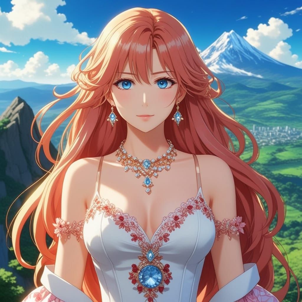 This image depicts a serene and beautiful anime-inspired goddess standing at a majestic mountain summit, surrounded by ethereal golden hour lighting and delicate, shimmering makeup and jewelry accents, with a perfect blend of vibrant colors and soft brushstrokes.