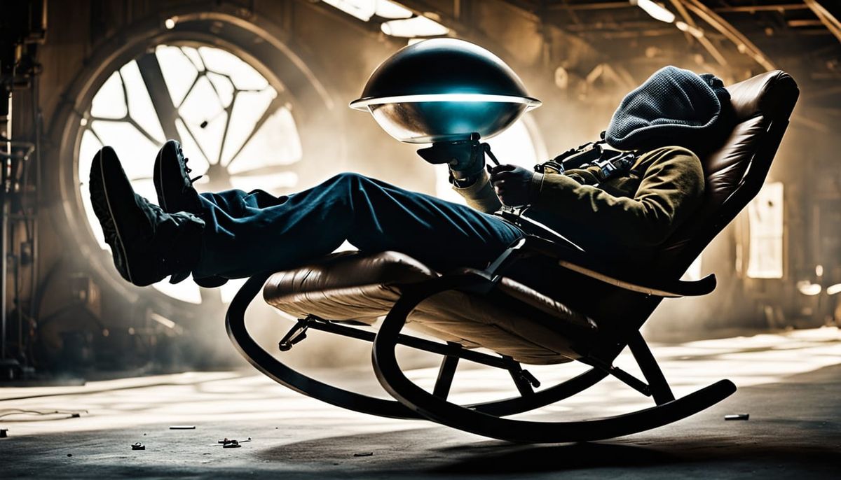 This image shows a bandit resting in a steel rocking chair, seemingly unconcerned as a flying saucer appears overhead. The photo has a documentary style, with earthy tones and sharp focus.