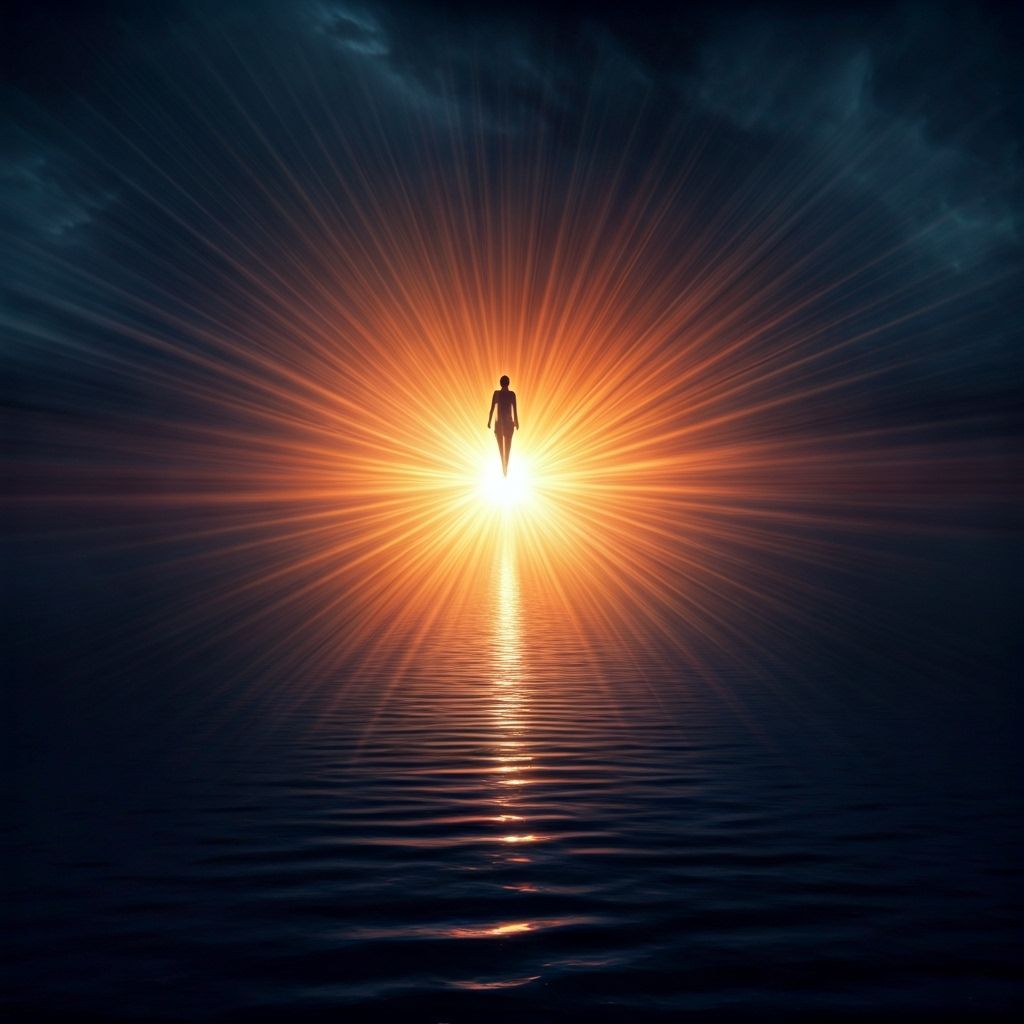 This image displays a hyperdetailed surreal portrait where a sunset explodes from within the mind, merging abstract elements with reality in a misty, ethereal fantasy style.