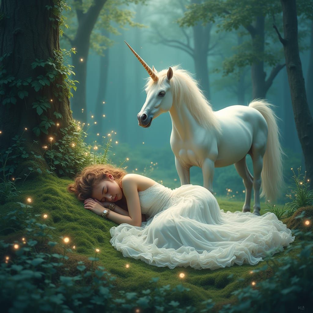 A 3D colored chalk illustration of a lady sleeping on mossy ground with glowing flowers. A unicorn nearby adds to the serene, whimsical fantasy scene.
