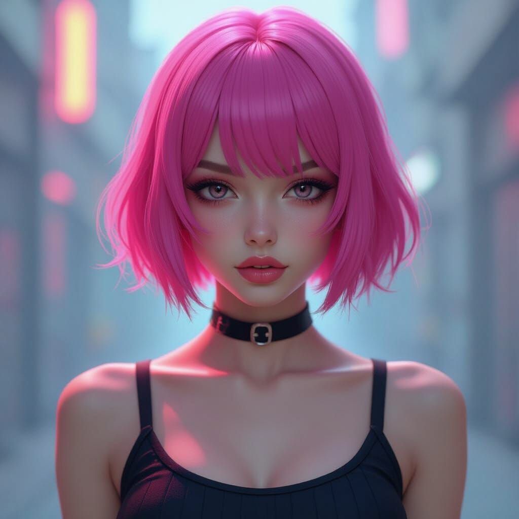 A low-angle shot of an androgynous figure in a black skirt and pink wig. The face is hidden, with neon pink accents, soft lighting, and an abstract background in a fantasy concept art style.
