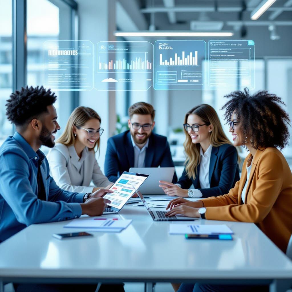 This image shows diverse young students working together at a modern desk, analyzing job search materials with futuristic digital overlays. Digital art style with sharp focus and cinematic lighting.