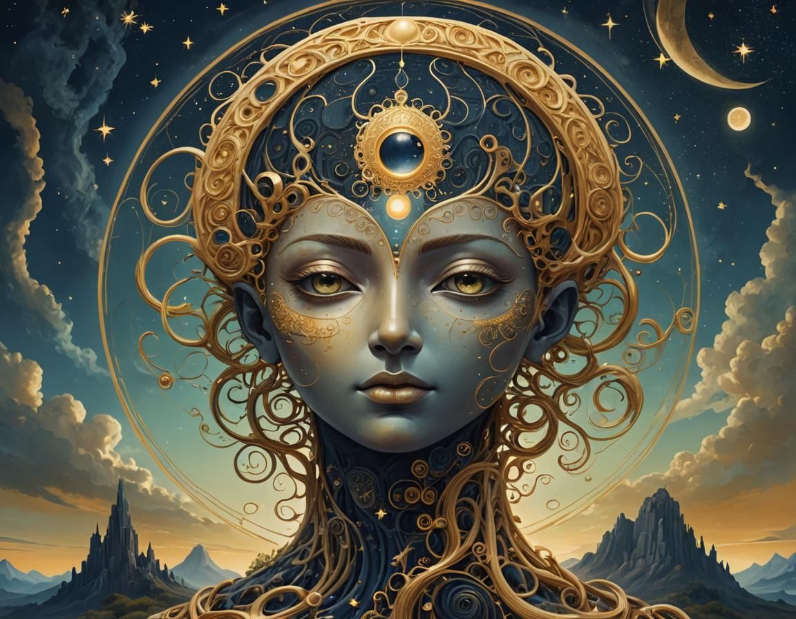A striking picture of a giant, moon-like head in an alien landscape. The digital artwork features golden swirls and architectural forms with soft, ethereal lighting in navy, gold, and green tones.