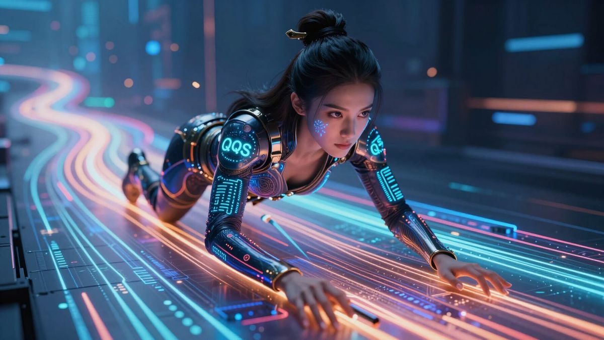 This image shows the Goddess of Traffic Shaping on a glowing data runway. She wears a high-fashion outfit and uses a Regulator Rod to command digital flow, in a cinematic style.
