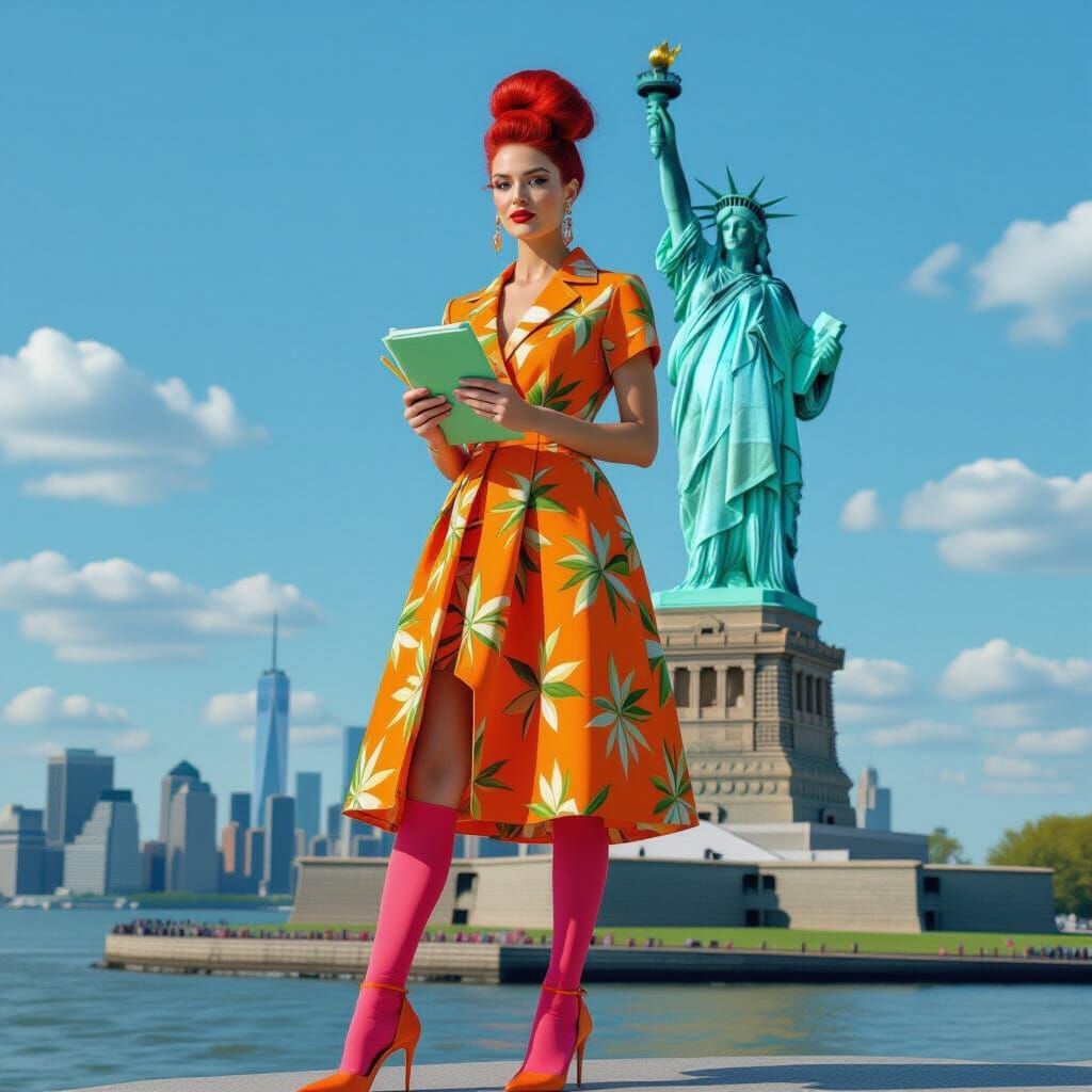 This image shows a woman with dark hair in a triple bun hairstyle standing on Liberty Island in New York City. She is wearing an orange tropical leaf print dress, pink knee-highs, and orange stilettos in photorealistic style.
