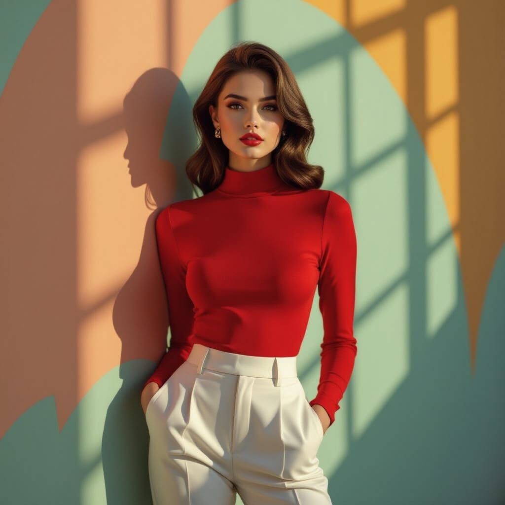 A photorealistic, waist-up portrait of a woman in a red top and white trousers, captured in a dramatic, cinematic vintage fashion style with strong side lighting and deep color.