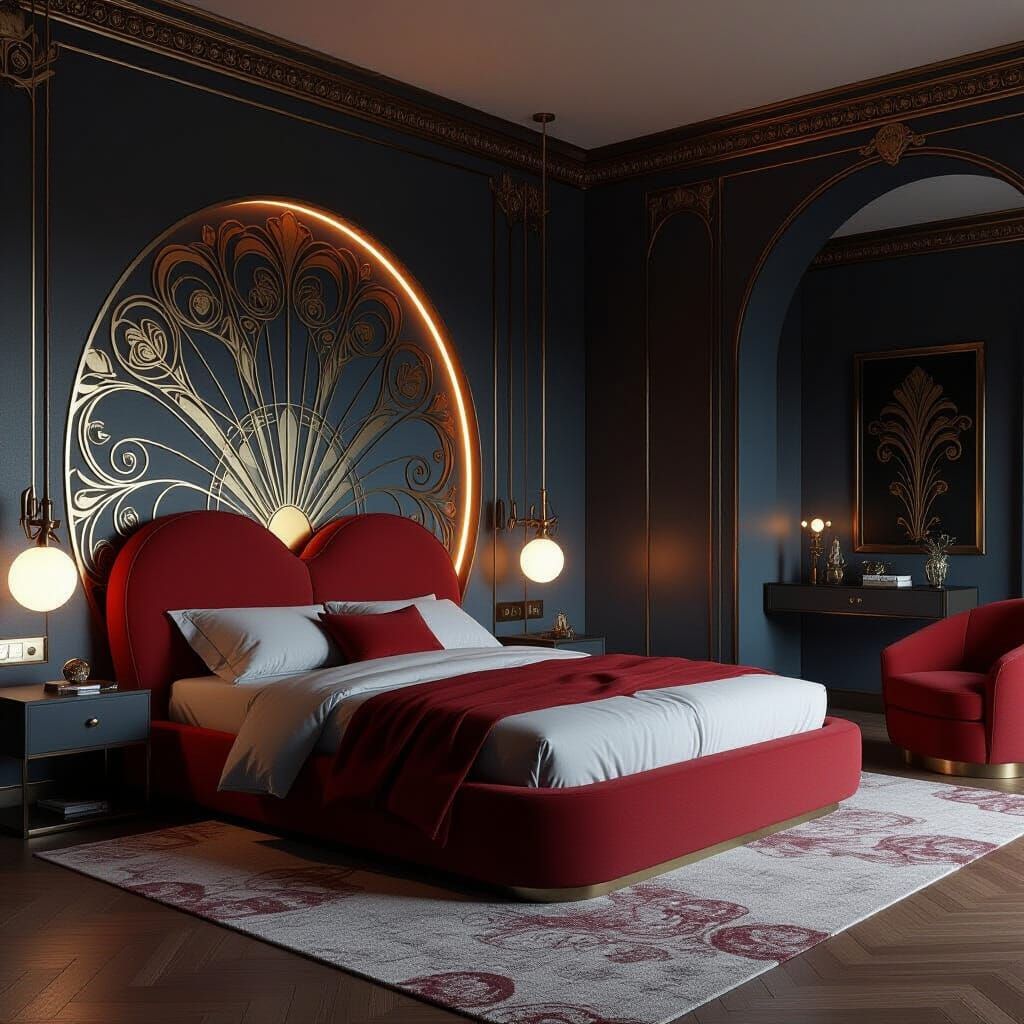 A modern bedroom featuring a heart-shaped bed and dim, warm lighting. The design blends art nouveau elegance with futuristic and minimalist elements in a dark color palette.