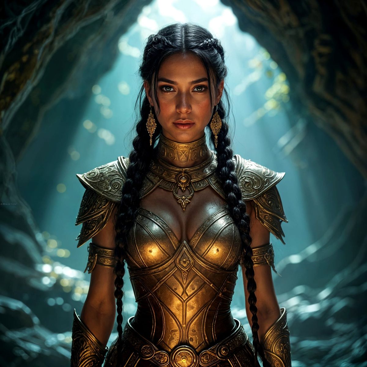 This image shows a Latina warrior queen in golden armor, standing in a softly lit cavern. The portrait features intricate details, dynamic lighting, and vibrant colors, rendered with photorealistic techniques.