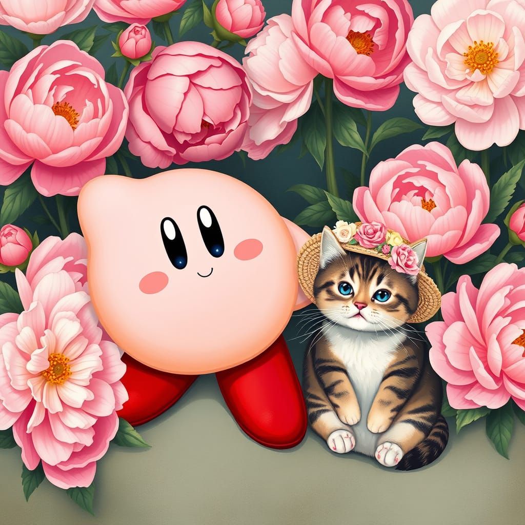 This image shows Kirby and Pusheen enjoying a vibrant peony garden. Kirby wears a bright yellow shirt and red shoes, while Pusheen sports a floral sun hat, all in a whimsical, colorful style.