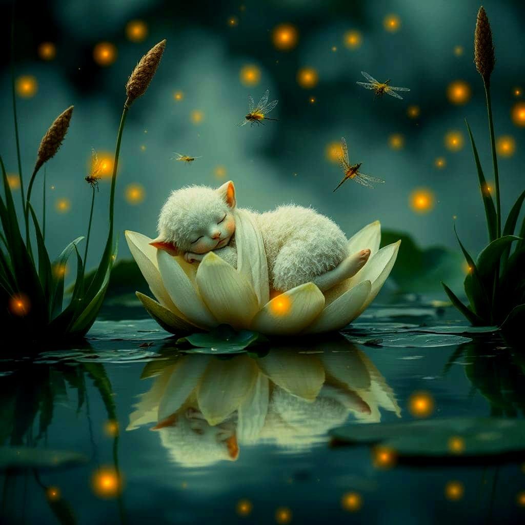 This image shows a fluffy white fairy-tale creature sleeping peacefully on a water lily pad. Glowing fireflies illuminate the misty, hyperdetailed fantasy scene in an ethereal style.