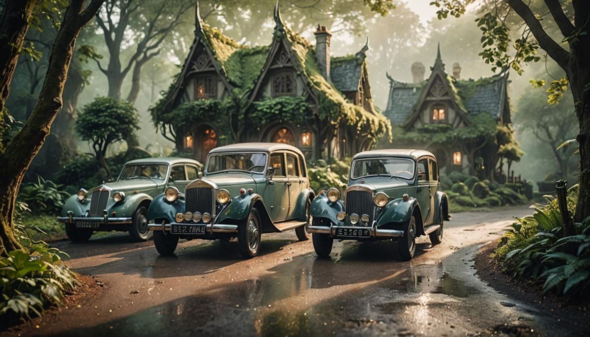 This image shows two vintage cars parked on a misty forest lane. The focus is on the automotive details, captured with cinematic bokeh, soft pastels, and a sunbeam illuminating the scene.
