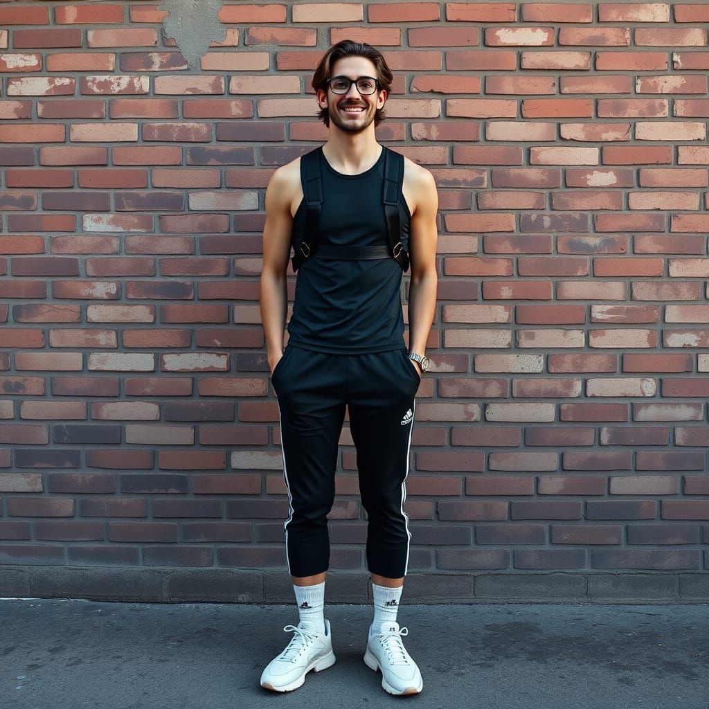 This image shows a relaxed, athletic man in streetwear standing against a brick wall. The photorealistic portrait captures fine details with textural elements, reminiscent of urban landscape photography.
