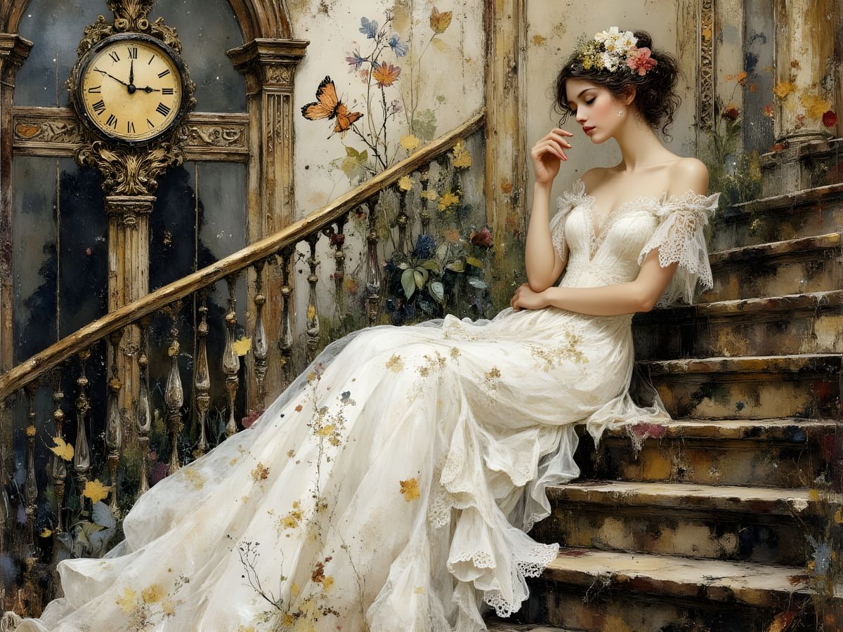<lora:divineOil:1.0> <lora:Earth and sketch:1.0> <lora:SeedreamFlux2:1.0> <lora:Illustrated Serenity:1.0> abstract surrealism bride with detailed face in long white wedding dress on a grand staircase with a clock at the top Alphonse Mucha Tim Burton Gustav Klimt Edward Hopper romanticism surrealism splash ...